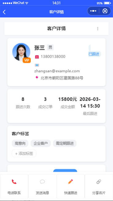 一张营销名片 = 个人介绍 + 公司信息 + 产品 / 服务 + 案例 + 联系方式 + 官网 / 商城 / 视频,一次发送,永久有效。